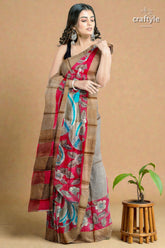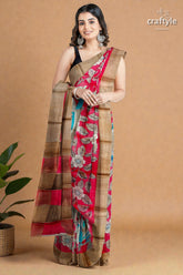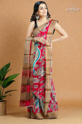 Apple Red Hand Painted Kalamkari Work Pure Tussar Silk Saree with Zari Border