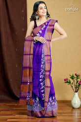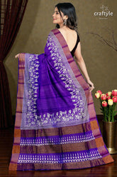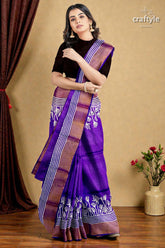 Deep Violet Floral Motif Pure Tussar Saree with Hand Block Print Zari Border