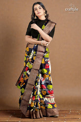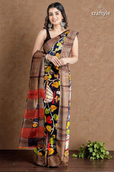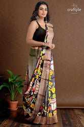 Ebony Black Hand-Painted Pure Tussar Kalamkari Saree with Zari Border