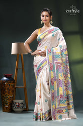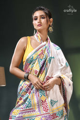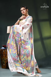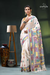 Multithread Gujrati Embroidery White Silk Kantha Stitch Saree
