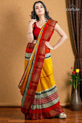 Saffron Yellow Pure Tussar Silk Saree with Hand Block Print and Zari Border